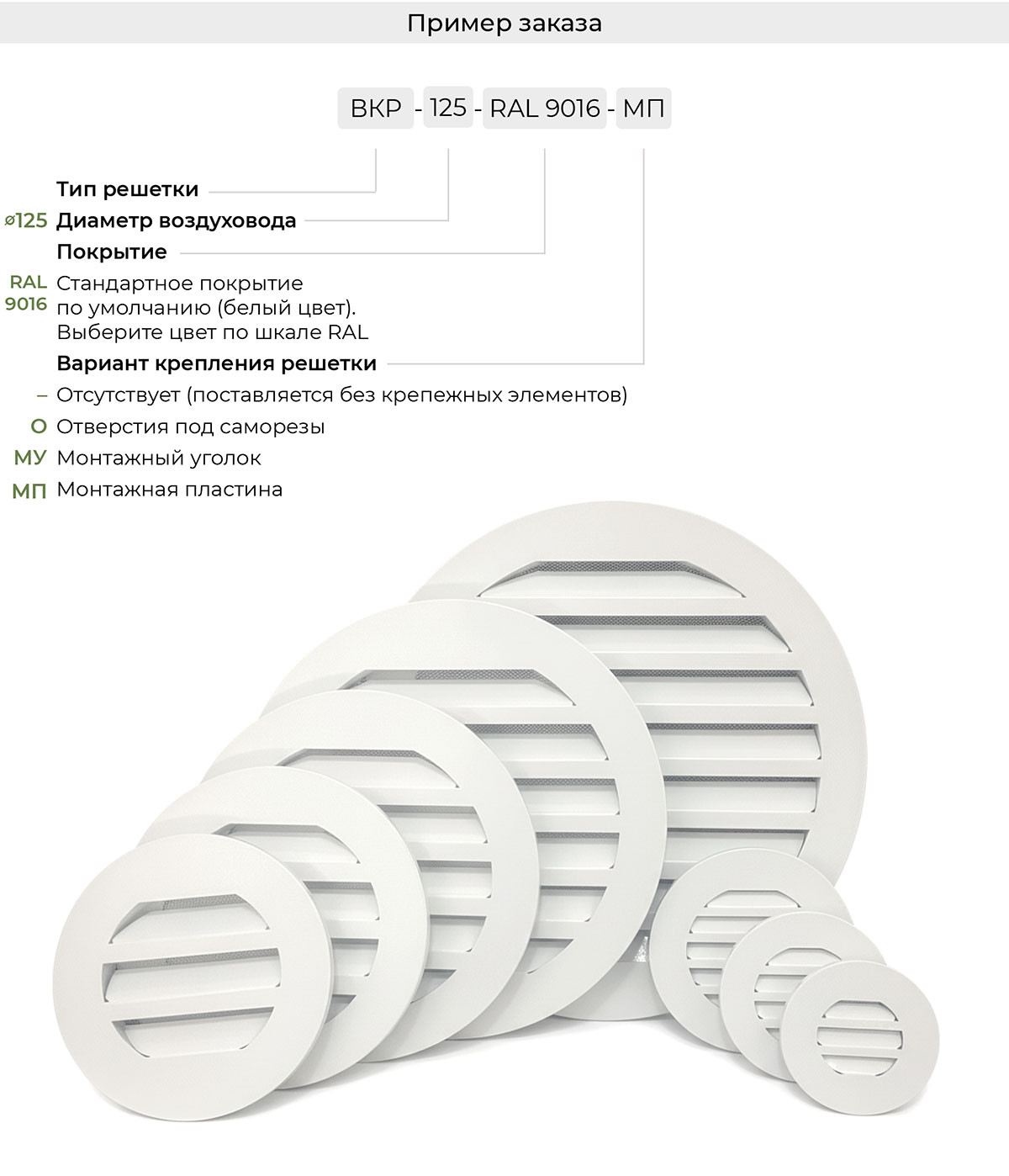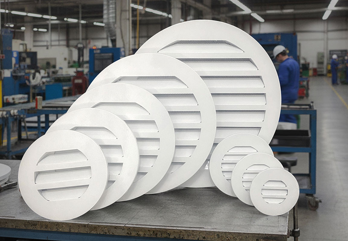 Решетка ВКР изготавливается из оцинкованного листового металлопроката толщиной 0,9 мм и окрашивается порошковыми полиэфирными эмалями в любой цвет по международной шкале RAL. Такое сочетание материала, используемого при производстве и финишной обработке, гарантированно обеспечивает защиту от коррозии, а также от выцветания/потускнения под воздействием ультрафиолета. По умолчанию решетки окрашиваются в белый цвет RAL 9016.