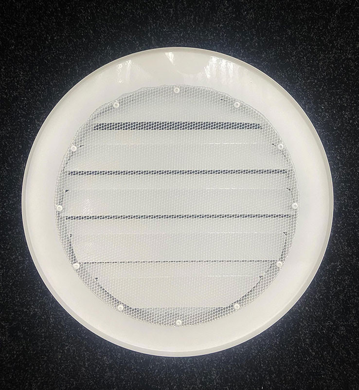 Решетка представляет собой рамку и полотно из ламелей, отогнутых внутрь на 45°. На тыльной стороне решетки установлена сетка для защиты вентиляционного канала от крупного мусора и грызунов.