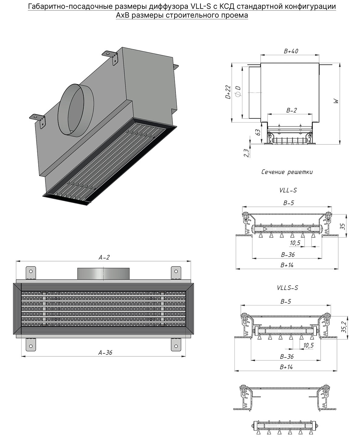 Размер монтажного пространства (W) напрямую зависит от размера подключаемого воздуховода - чем меньше воздуховод, тем меньше адаптер для диффузора. В каталоге приведены рекомендуемые размеры воздуховода, но по запросу заказчика возможно изготовить адаптер с любой врезкой.